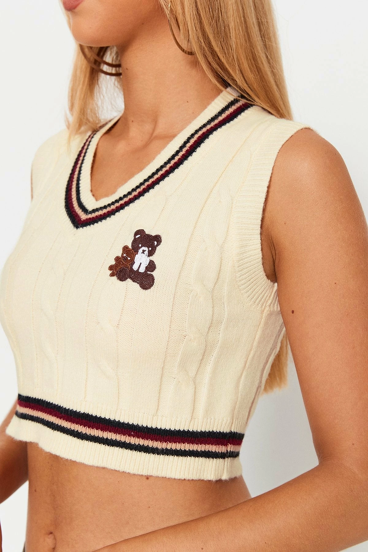 Style:PreppyColor:BeigeNeckline:V NeckSleeve Length: SleevelessHem Shaped:SlimComposition:100% Acrylic
