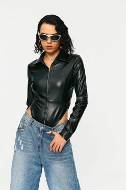 Be the first to review “SOLADO Lapel Neck Zipper Front PU Leather Bodysuit” Cancel reply