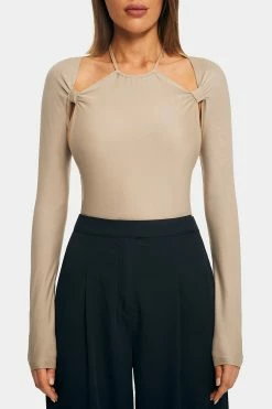 Style:SexyColor:TanSeason:Spring/Summer/AutumnNeckline:Halter NeckSleeve Length:Long SleeveHem Shaped:SlimComposition:95% Polyester, 5% Spandex