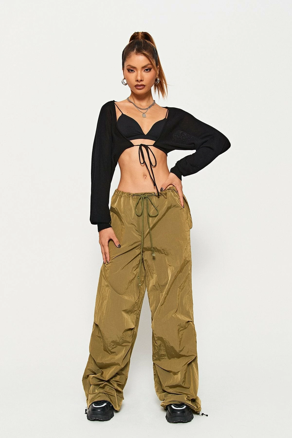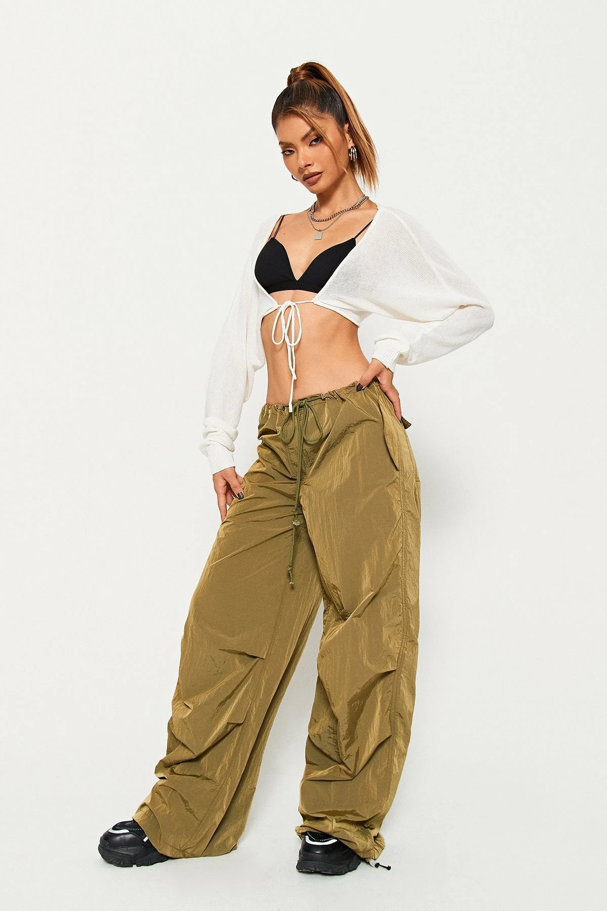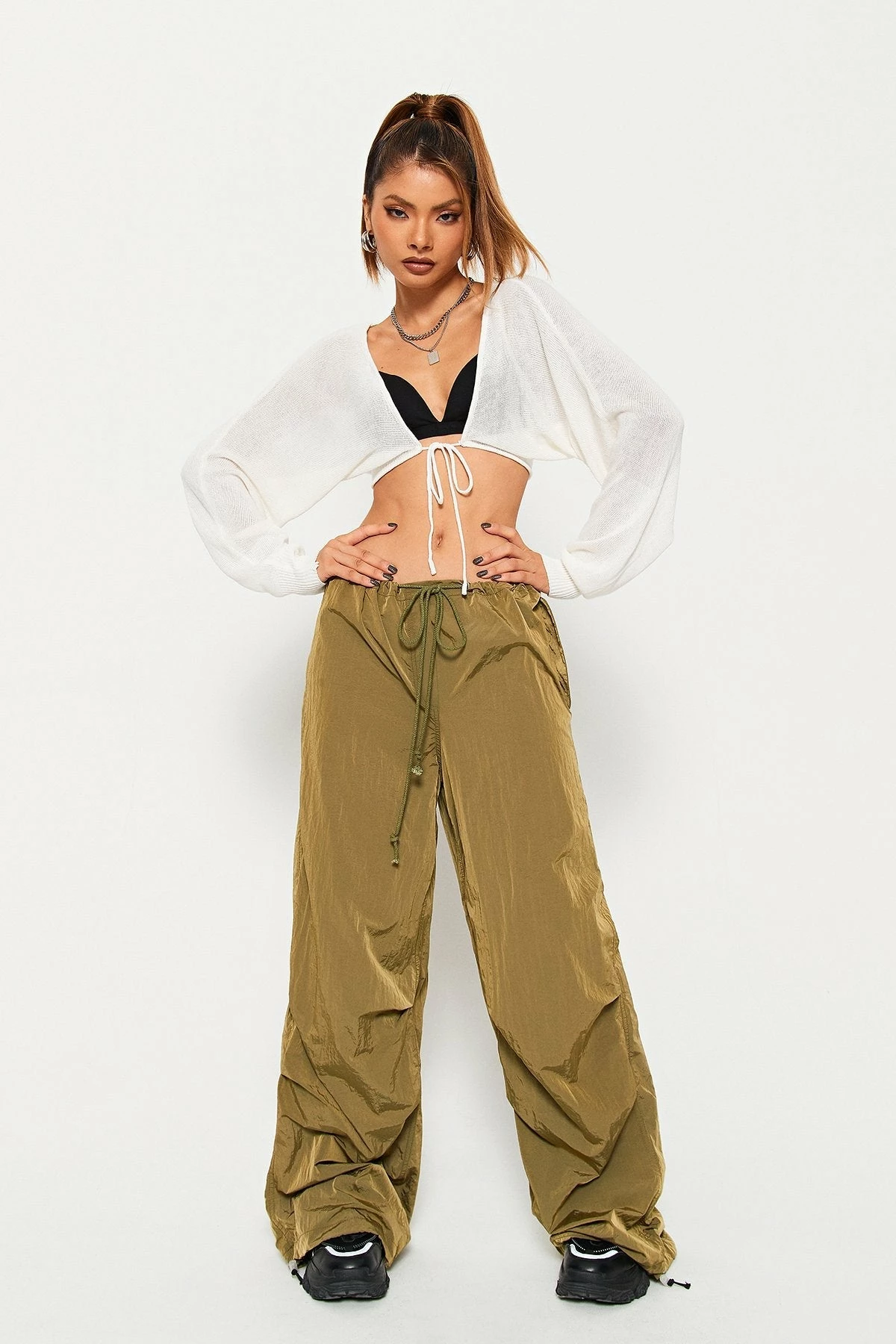 Style:BasicColor:Black/WhiteNeckline:Tie FrontSleeve Length:Long SleeveHem Shaped:SlimComposition: 100% Acrylic